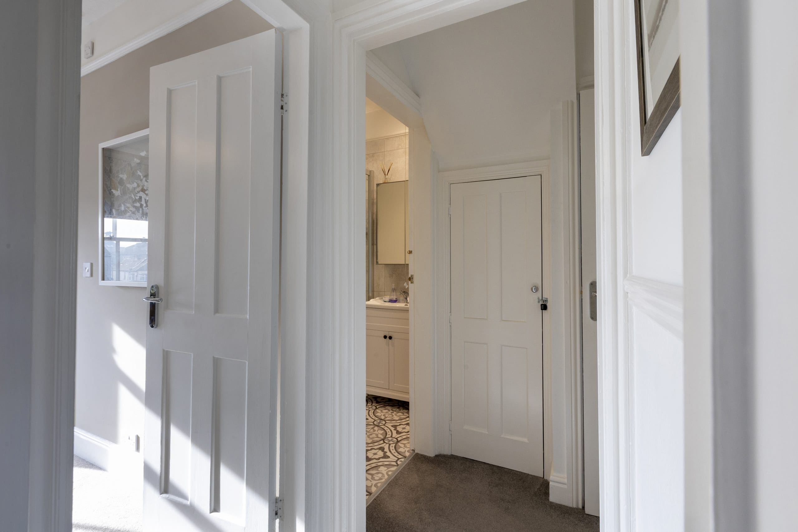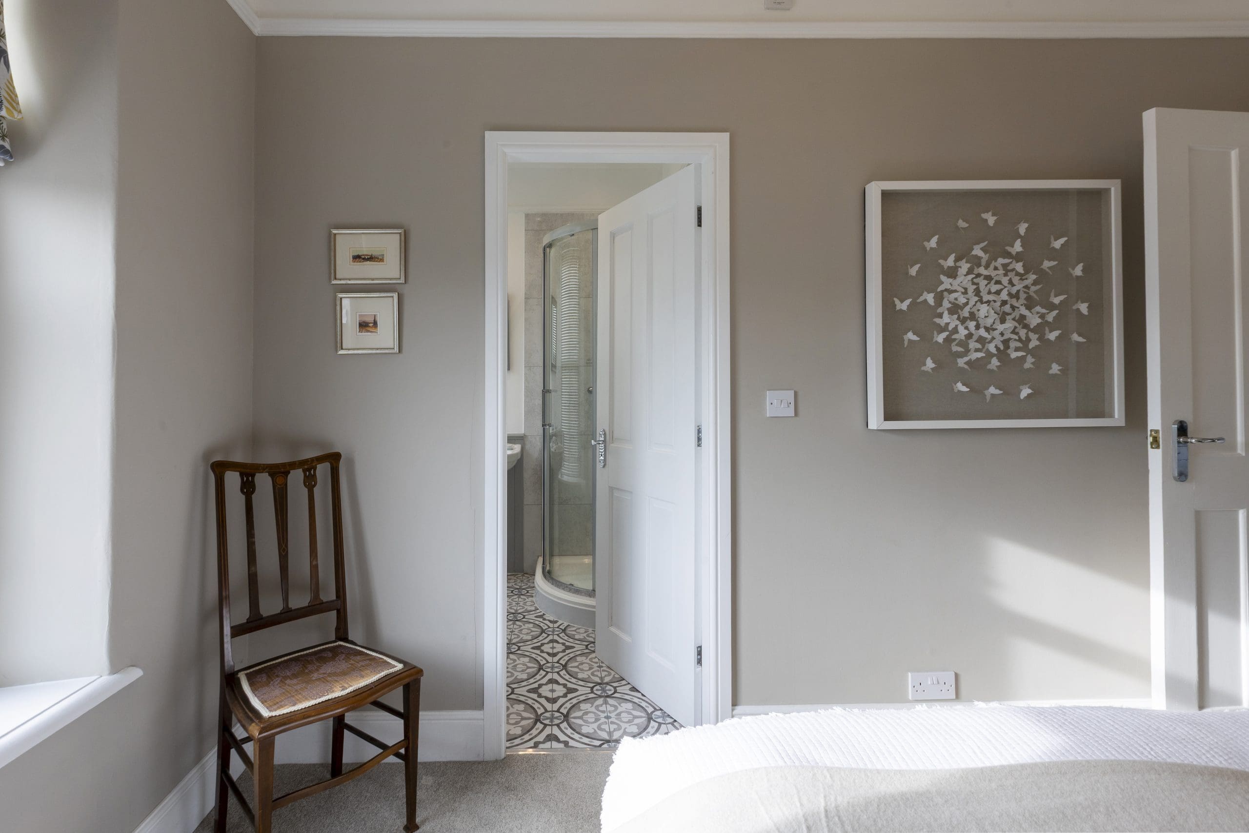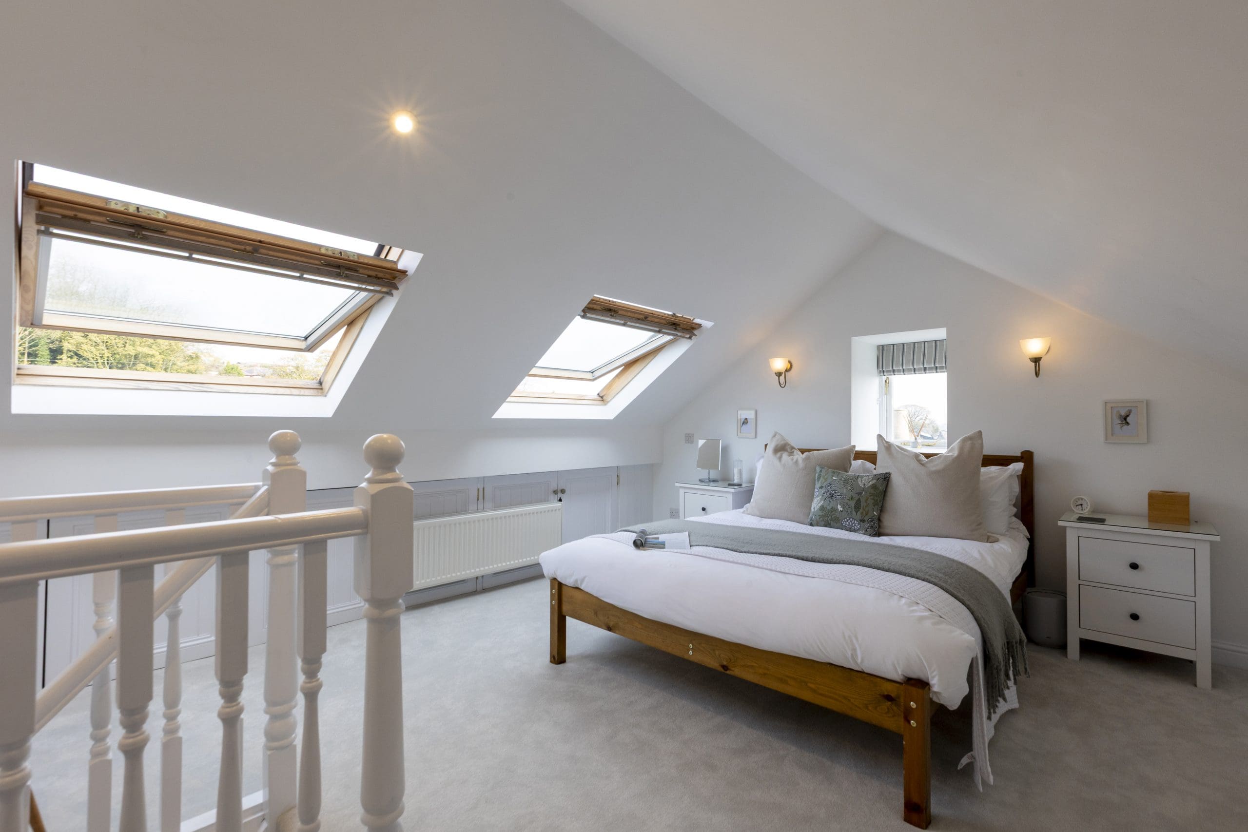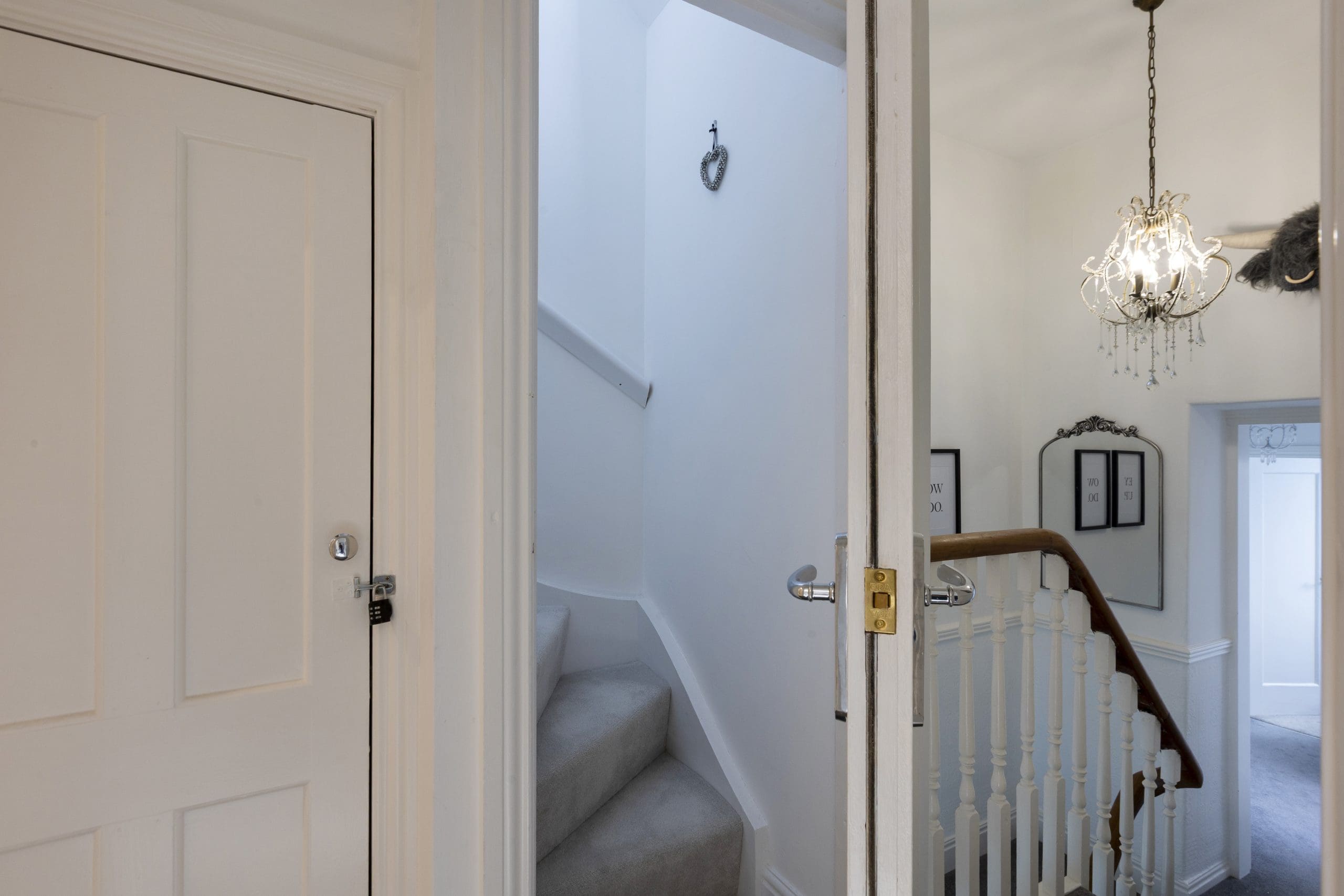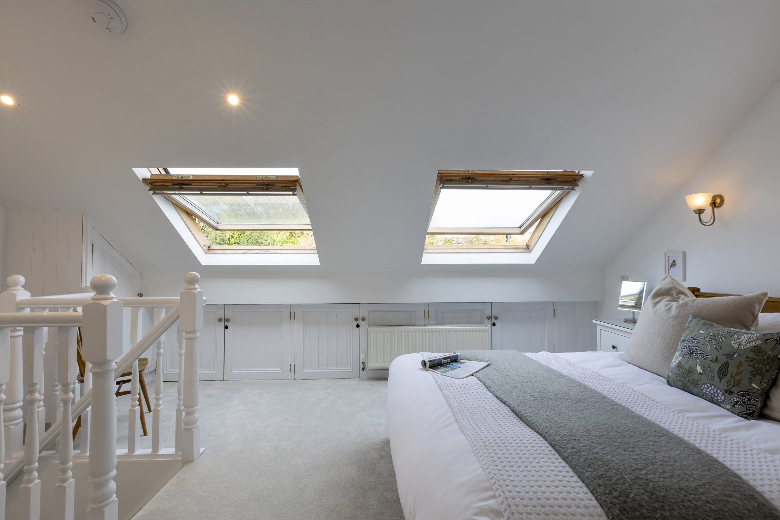 The first floor hosts three tastefully furnished double bedrooms, each bathing in natural light and dressed in soft, calming tones. One of the bedrooms features a stylish en-suite, while the other two share a modern bathroom and shower room, ensuring comfort and privacy for all. On the second floor, a bright loft suite can be found with double bed, fitted wardrobes, and Velux windows – offering a peaceful retreat under the eaves. Please note: the staircase to this room is steep and the ceilings sloped, making it best suited to older children or grown ups seeking a quiet sanctuary.