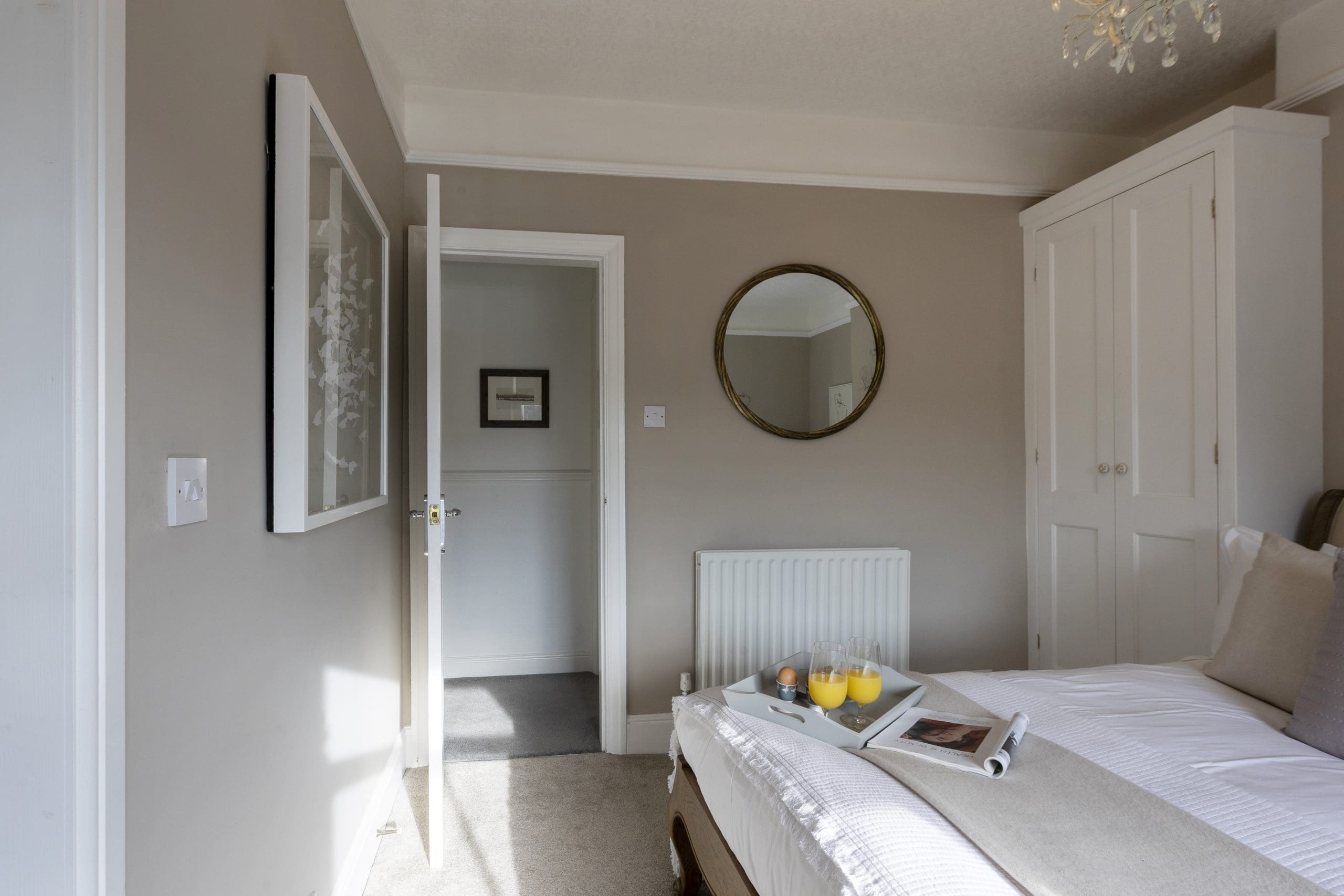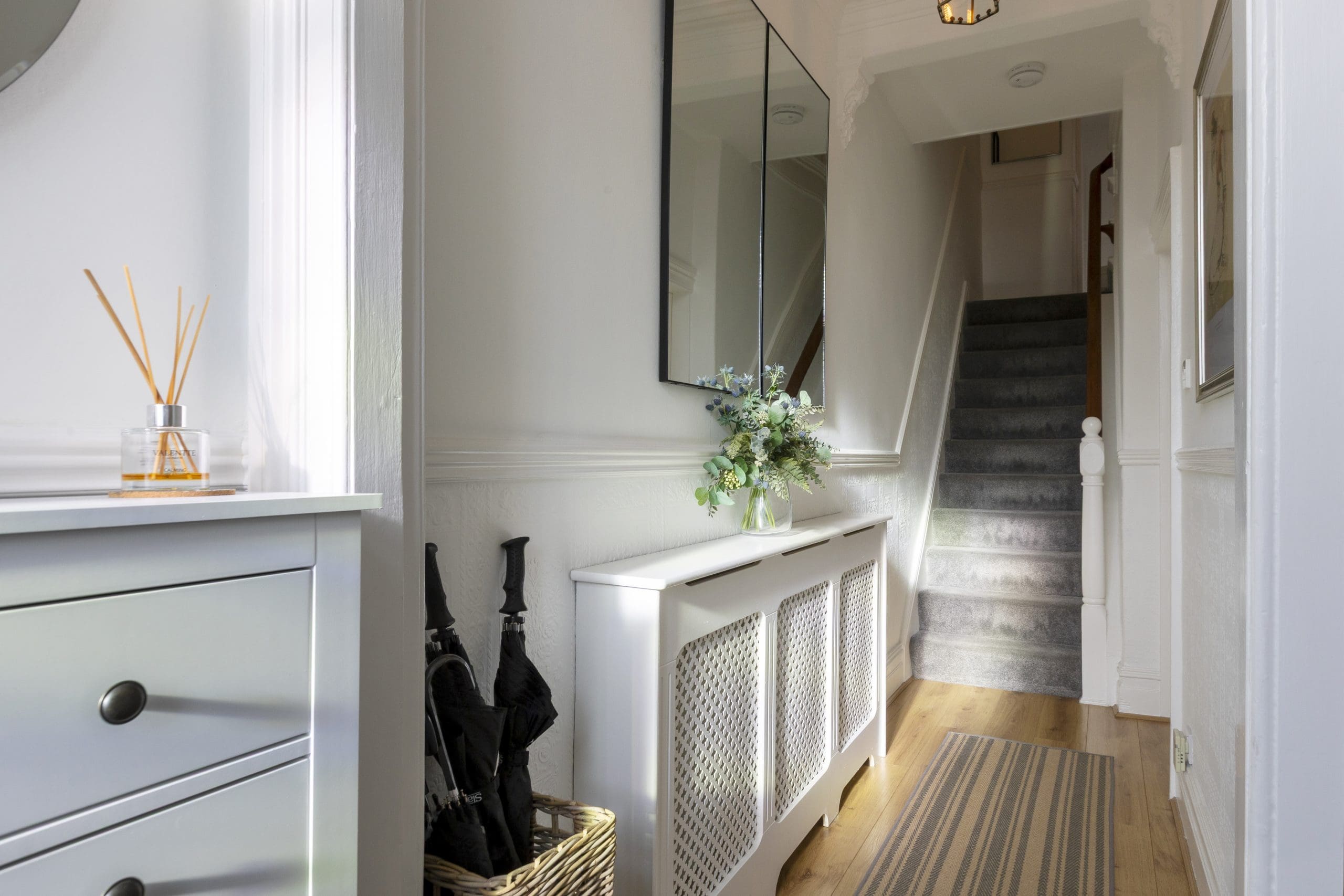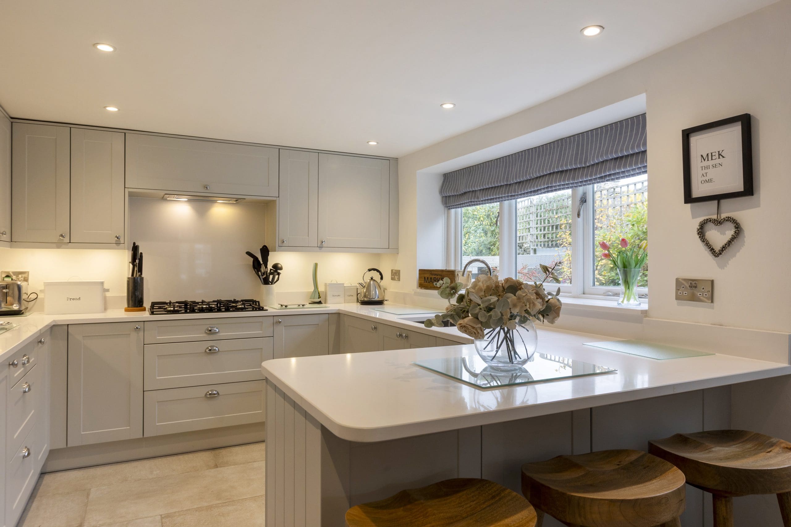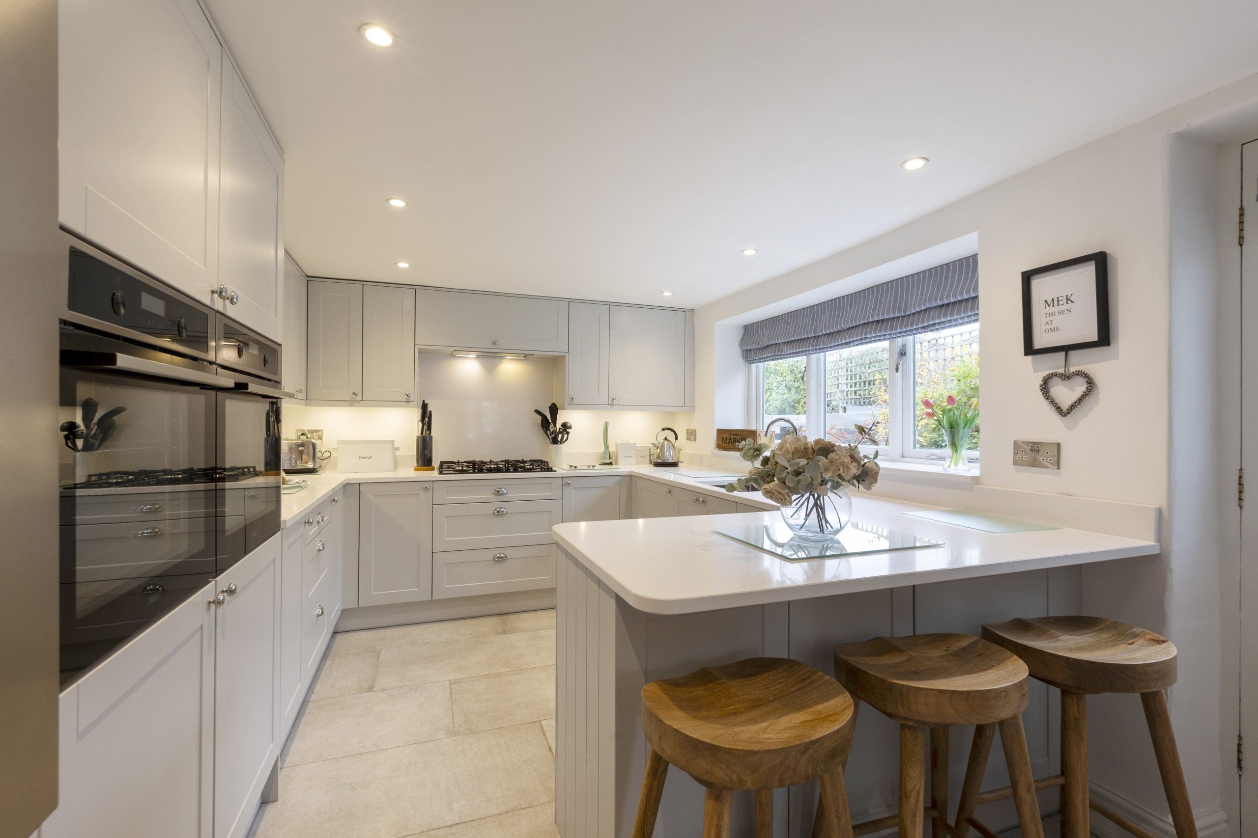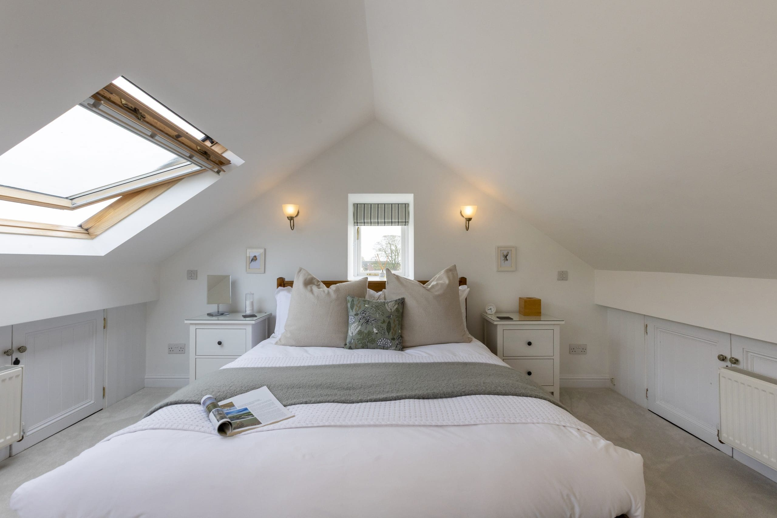 The first floor hosts three tastefully furnished double bedrooms, each bathing in natural light and dressed in soft, calming tones. One of the bedrooms features a stylish en-suite, while the other two share a modern bathroom and shower room, ensuring comfort and privacy for all. On the second floor, a bright loft suite can be found with double bed, fitted wardrobes, and Velux windows – offering a peaceful retreat under the eaves. Please note: the staircase to this room is steep and the ceilings sloped, making it best suited to older children or grown ups seeking a quiet sanctuary.