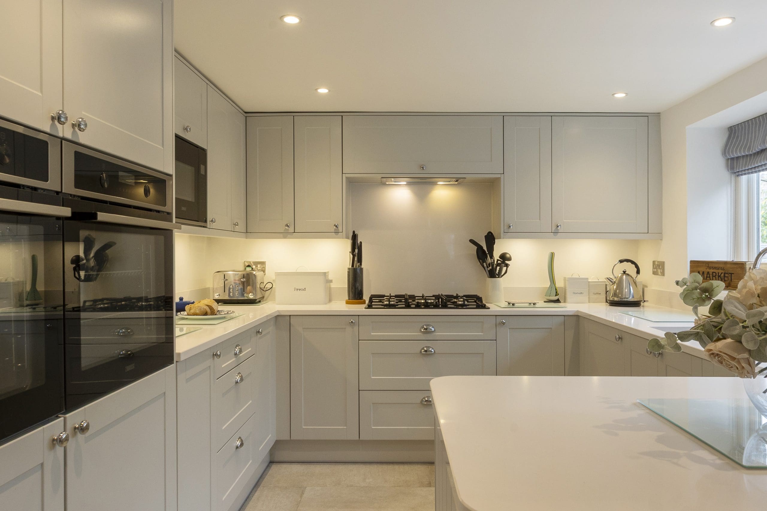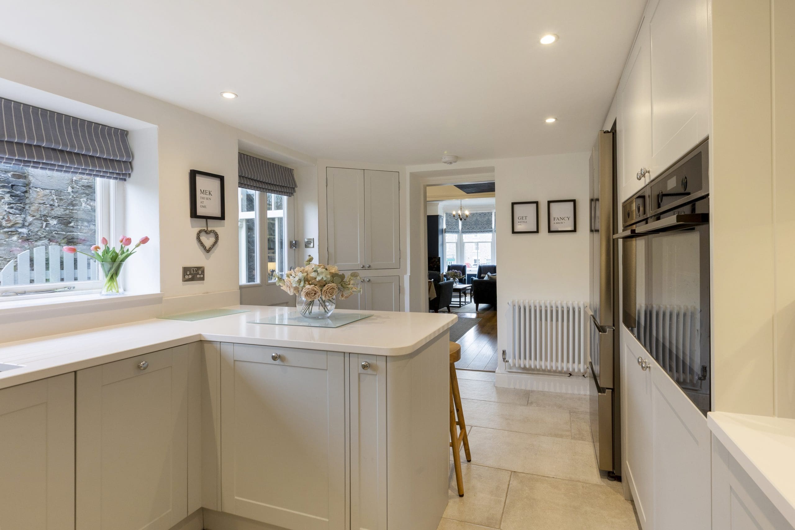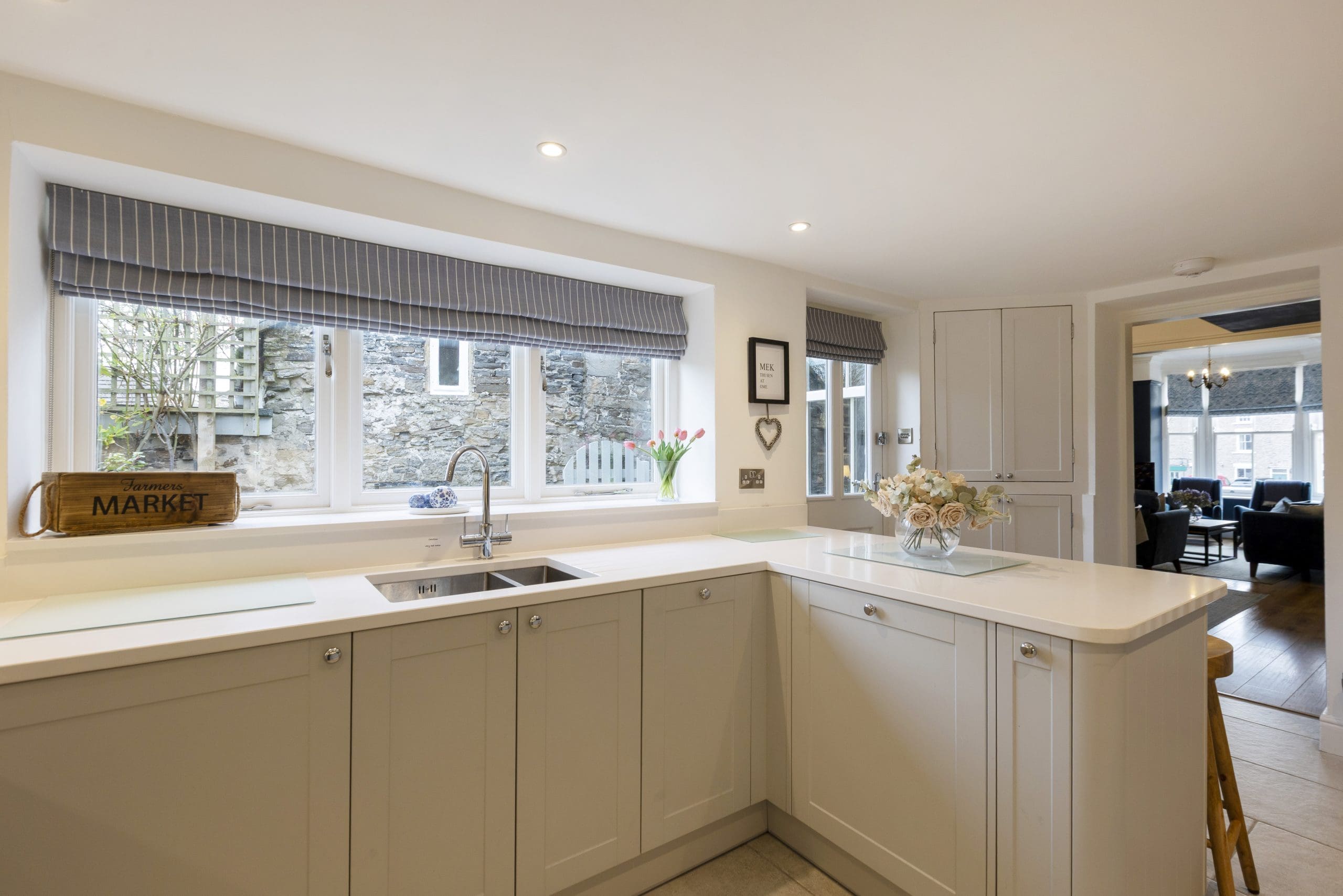 The Grove’s spacious dining area is a wonderful space to gather and socialise – where sunlight floods through tall windows and sociable views stretch across the rear garden. It’s here that you can enjoy long breakfasts before adventures outdoors, or return for leisurely suppers and laughter around the dinner table. The shaker-style kitchen is really well equipped with an American-style fridge freezer, split-level ovens, microwave, offering everything you need for relaxed food prepping.