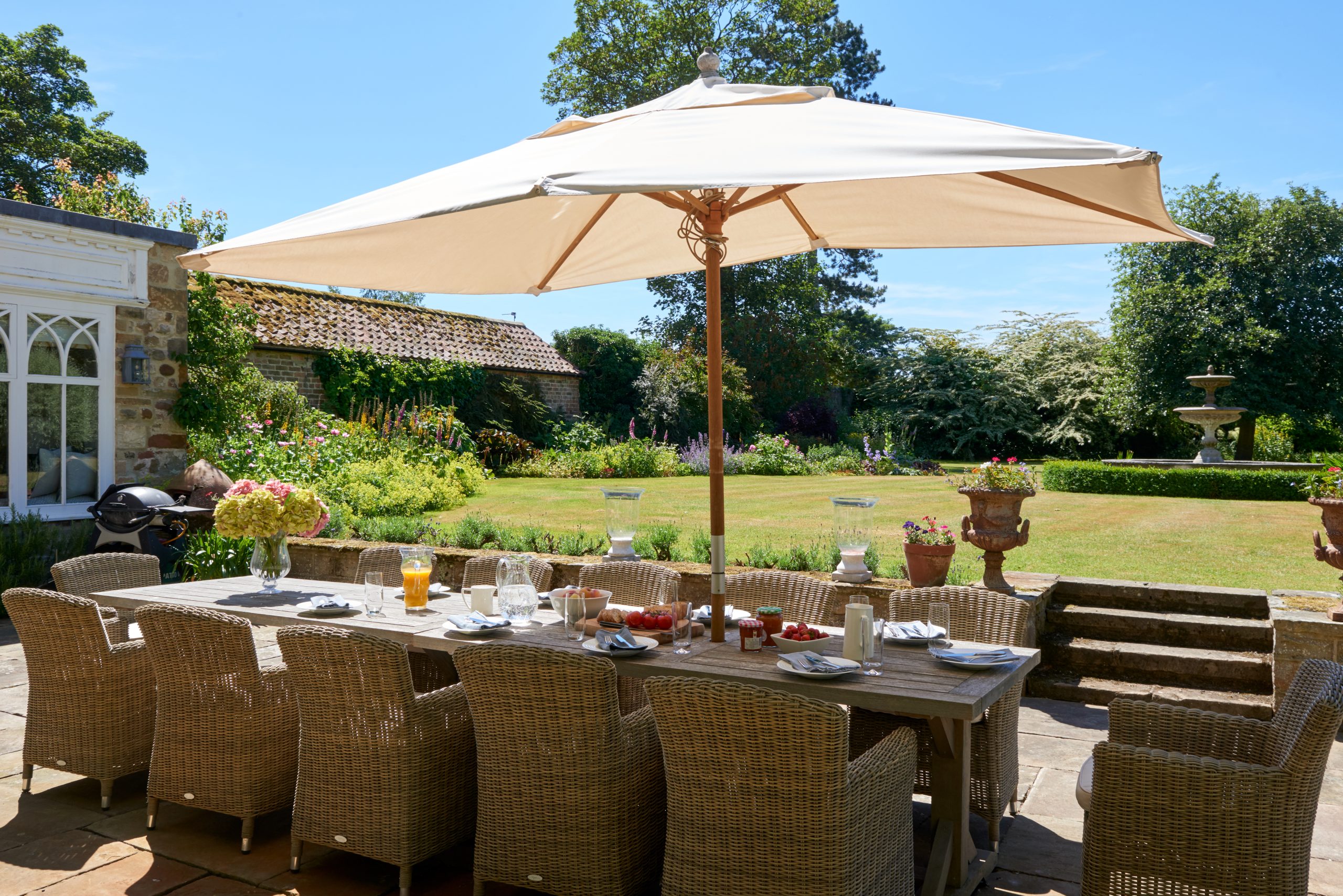 Entering into the house, you will find a beautiful hallway leading through to a modern bright fully equipped Kitchen with an Aga, a granite island and a kitchen table. There is access from the hall and kitchen into a large light dining room with tall sash windows and an open fireplace overlooking the gardens. Outdoor dining is also an option with a gas BBQ at your disposal and a large dining table and chairs on the patio. Weddings and events are possible here – please enquire and we will put you in touch with our event organiser to arrange.