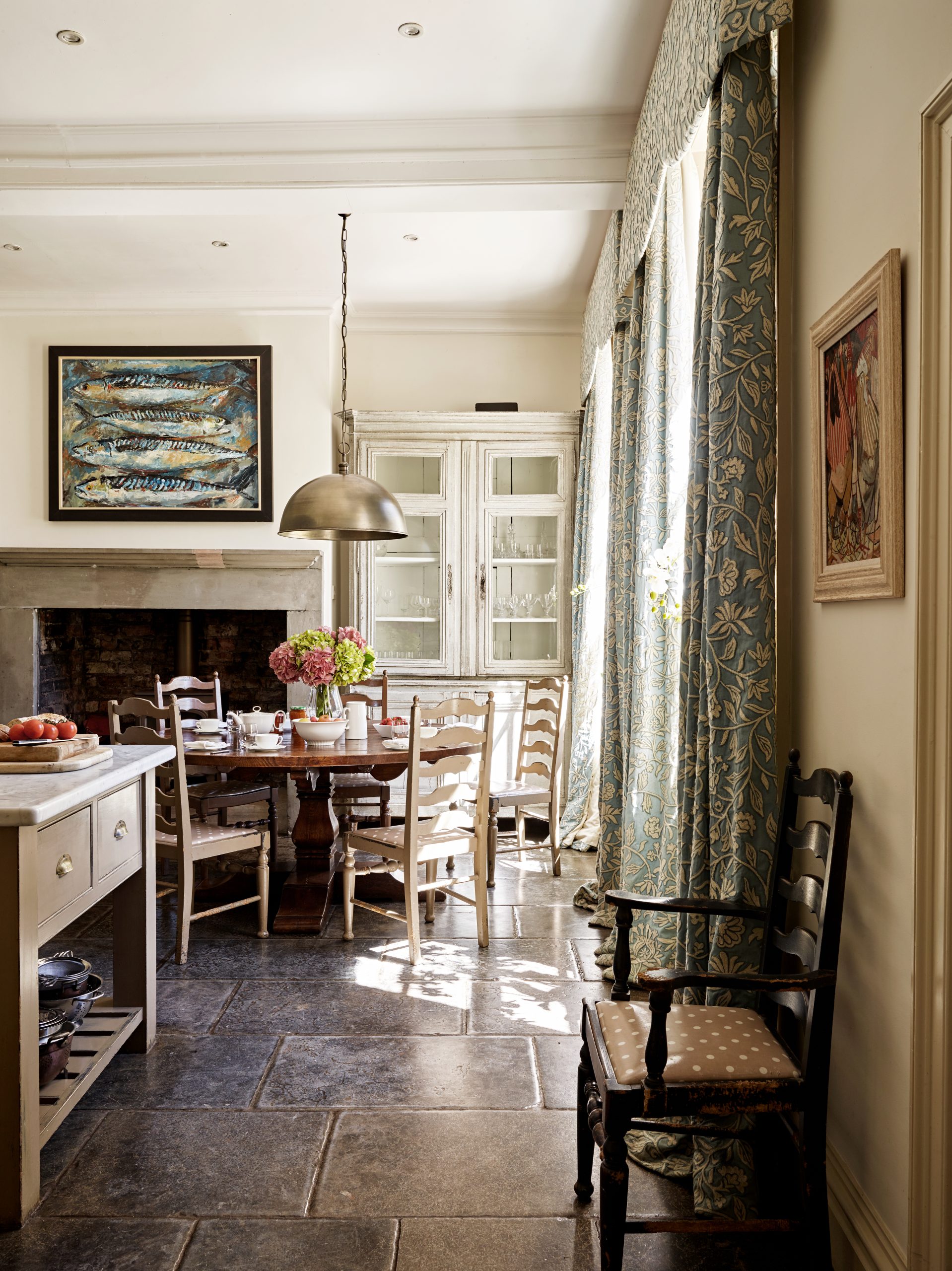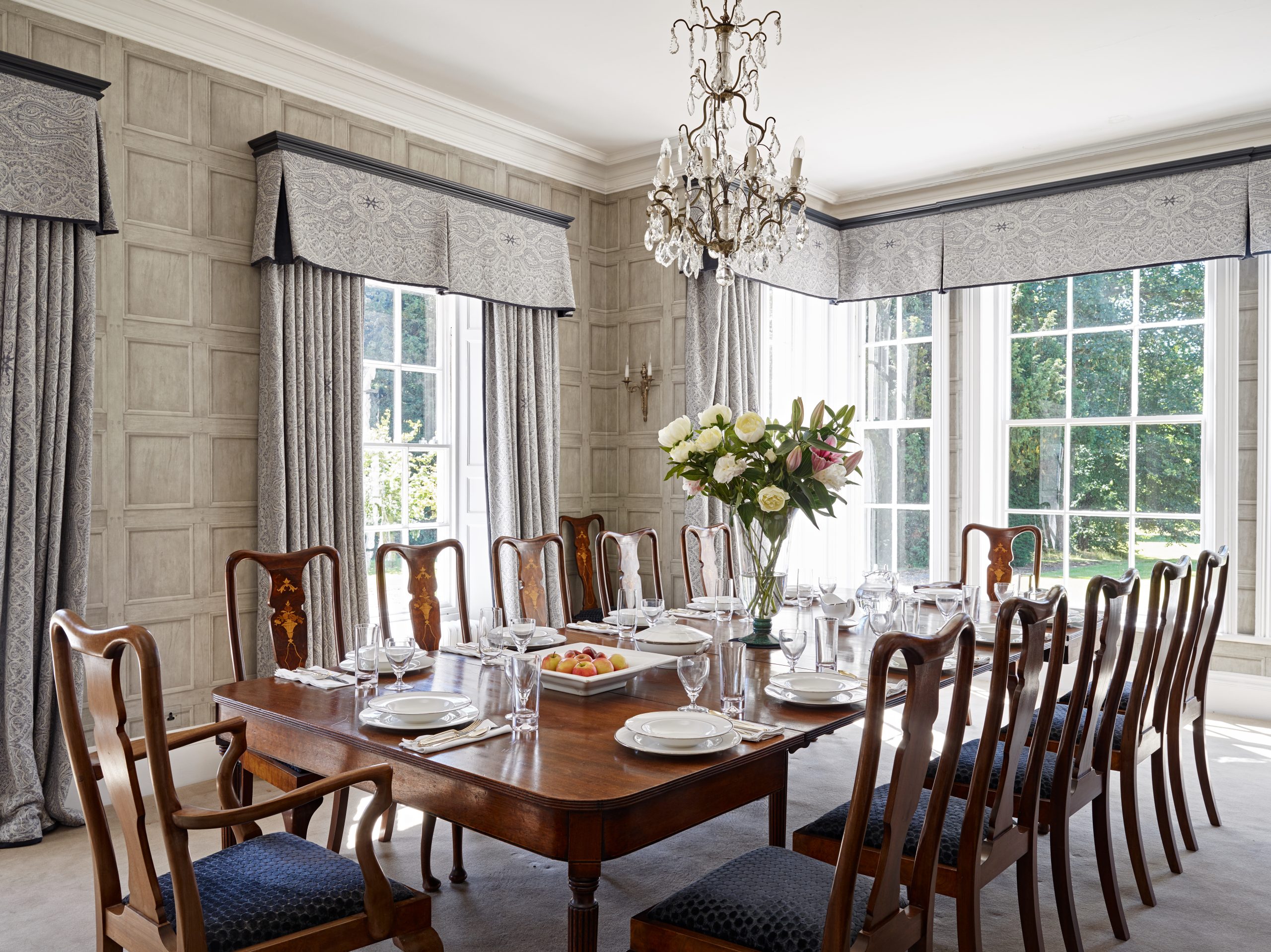 Dining Room with tall sash windows and open fireplace overlooking the gardens, access from the Kitchen adn Hall.