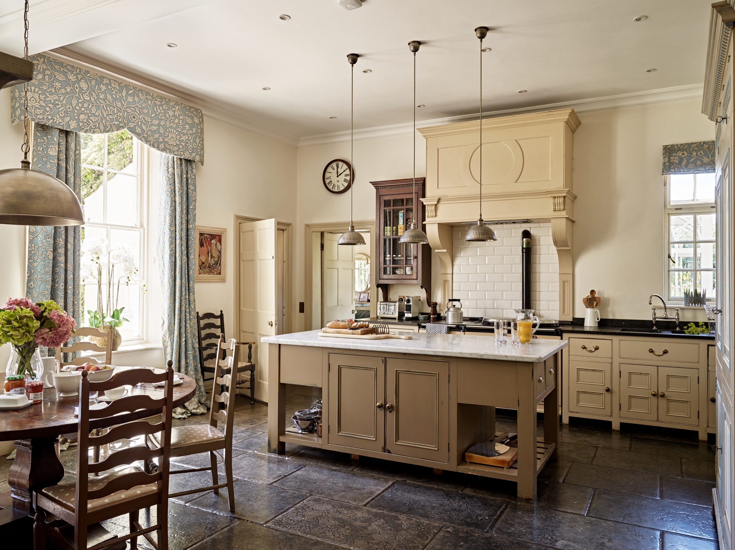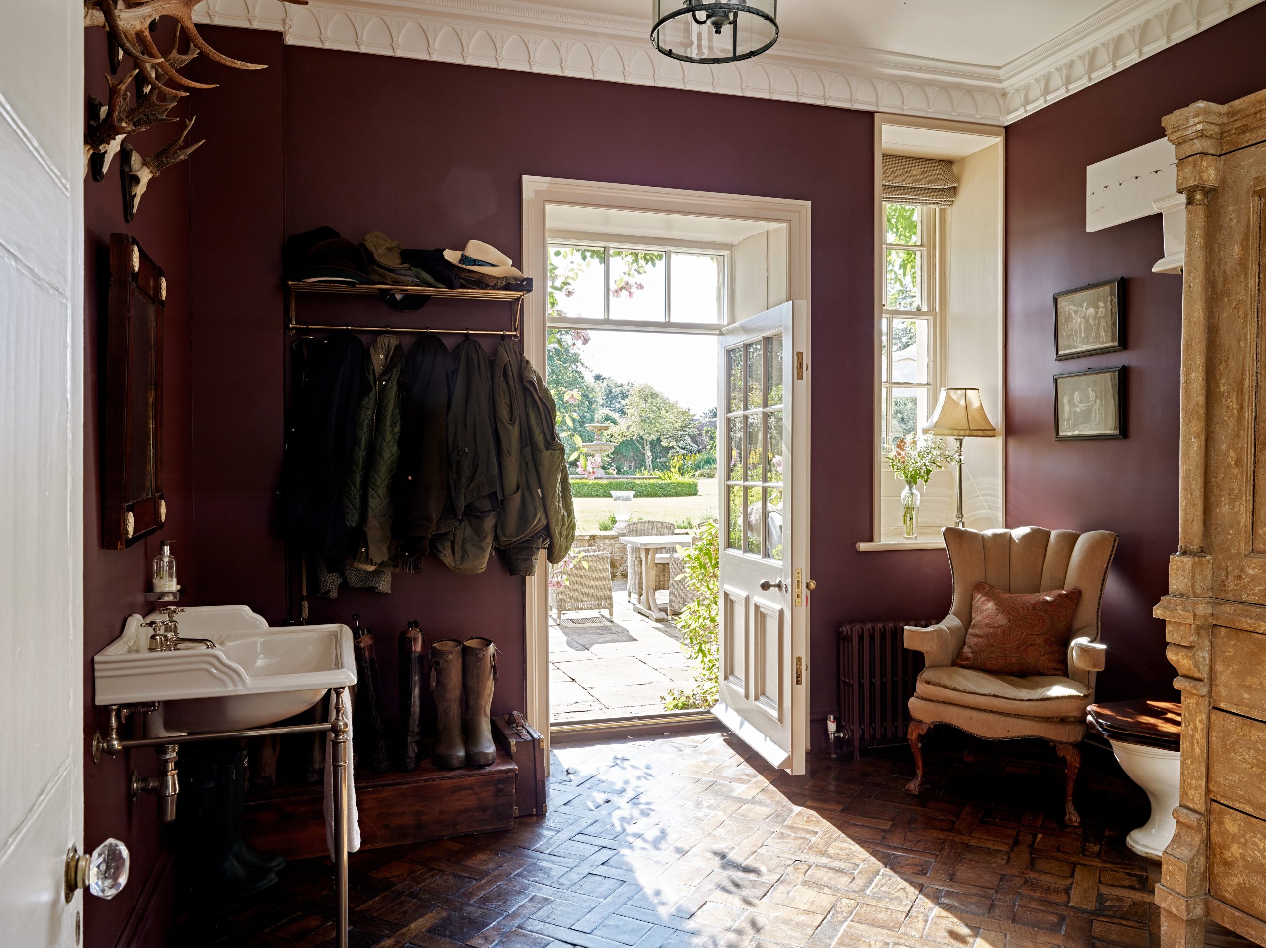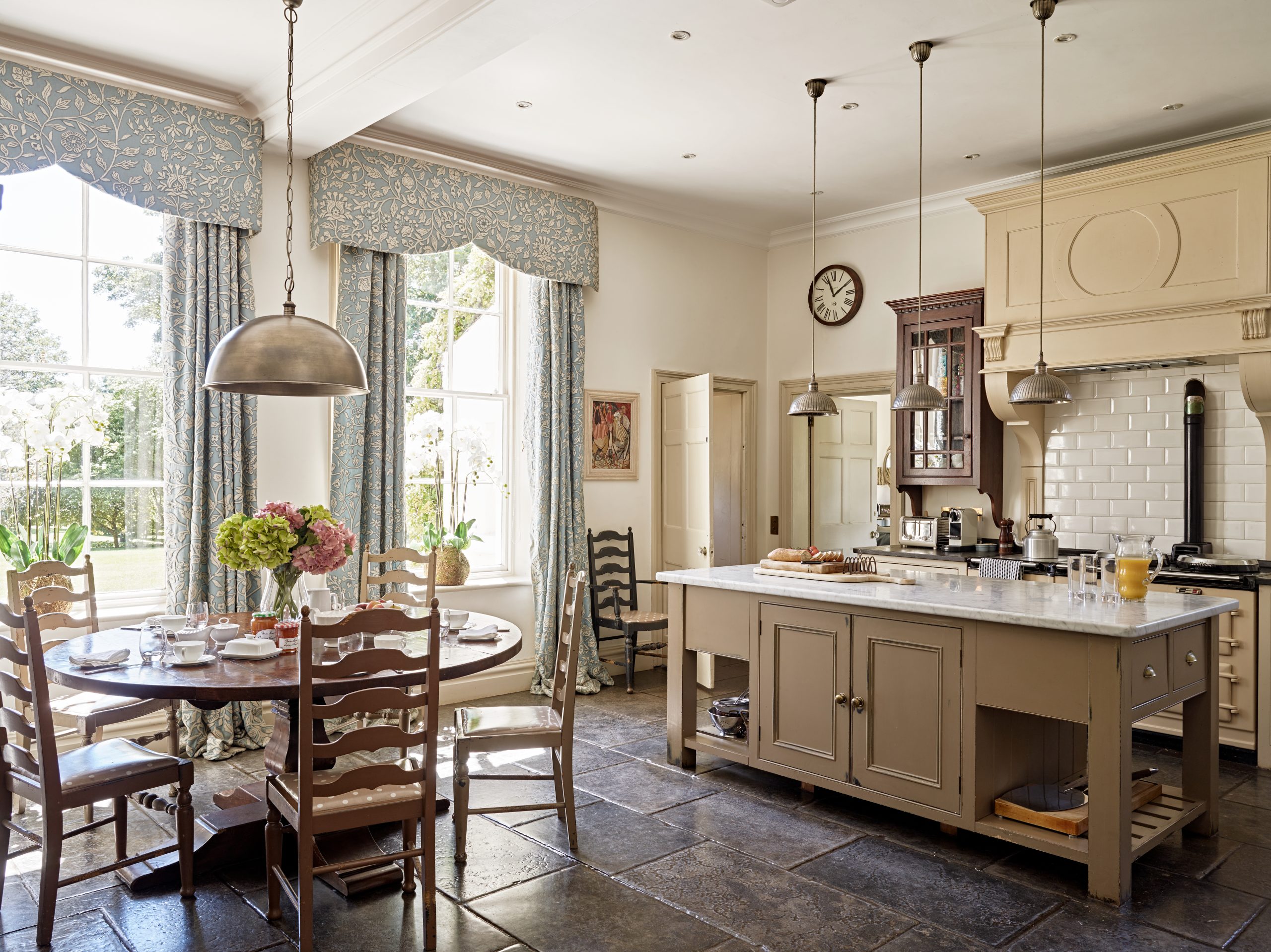 The large Entrance Hall leads through to a modern bright fully equipped Kitchen with an aga, island and round kitchen table.