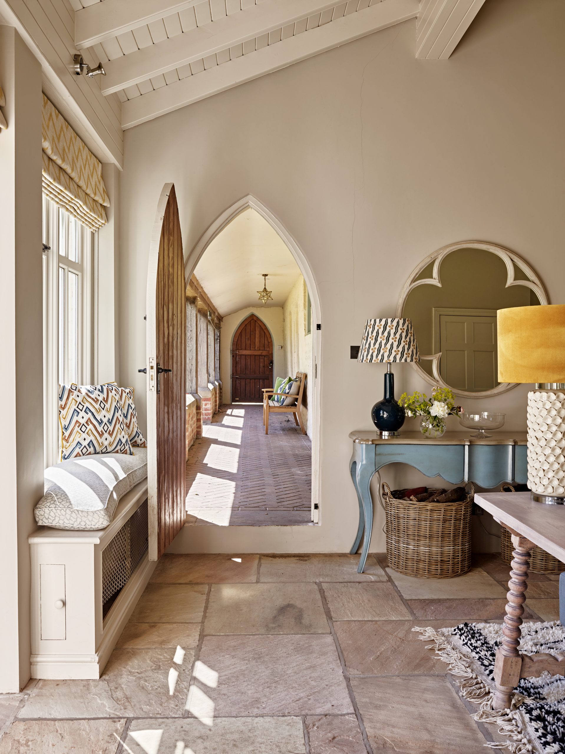 The Conservatory room leads out to the terrace with outdoor dining and seating and walled garden. This room also leads out through an arched door to a covered outside passage leading to the front of the house.