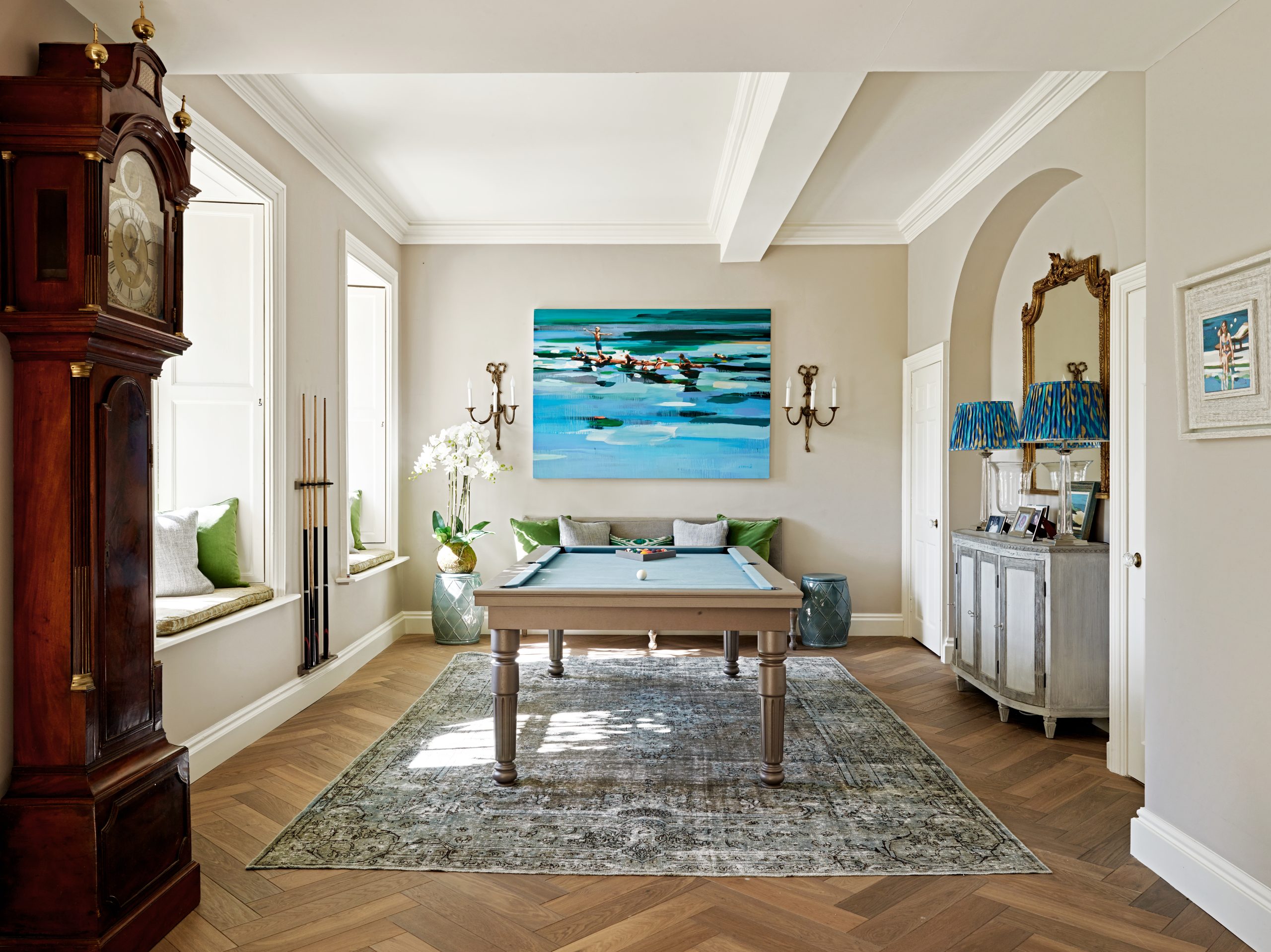 The Drawing Room is also situated off the hall and is a wonderful entertaining room with snooker table. There are French windows leading out onto the Terrace and Garden with outdoor Dining and BBQ and onto the walled Garden.