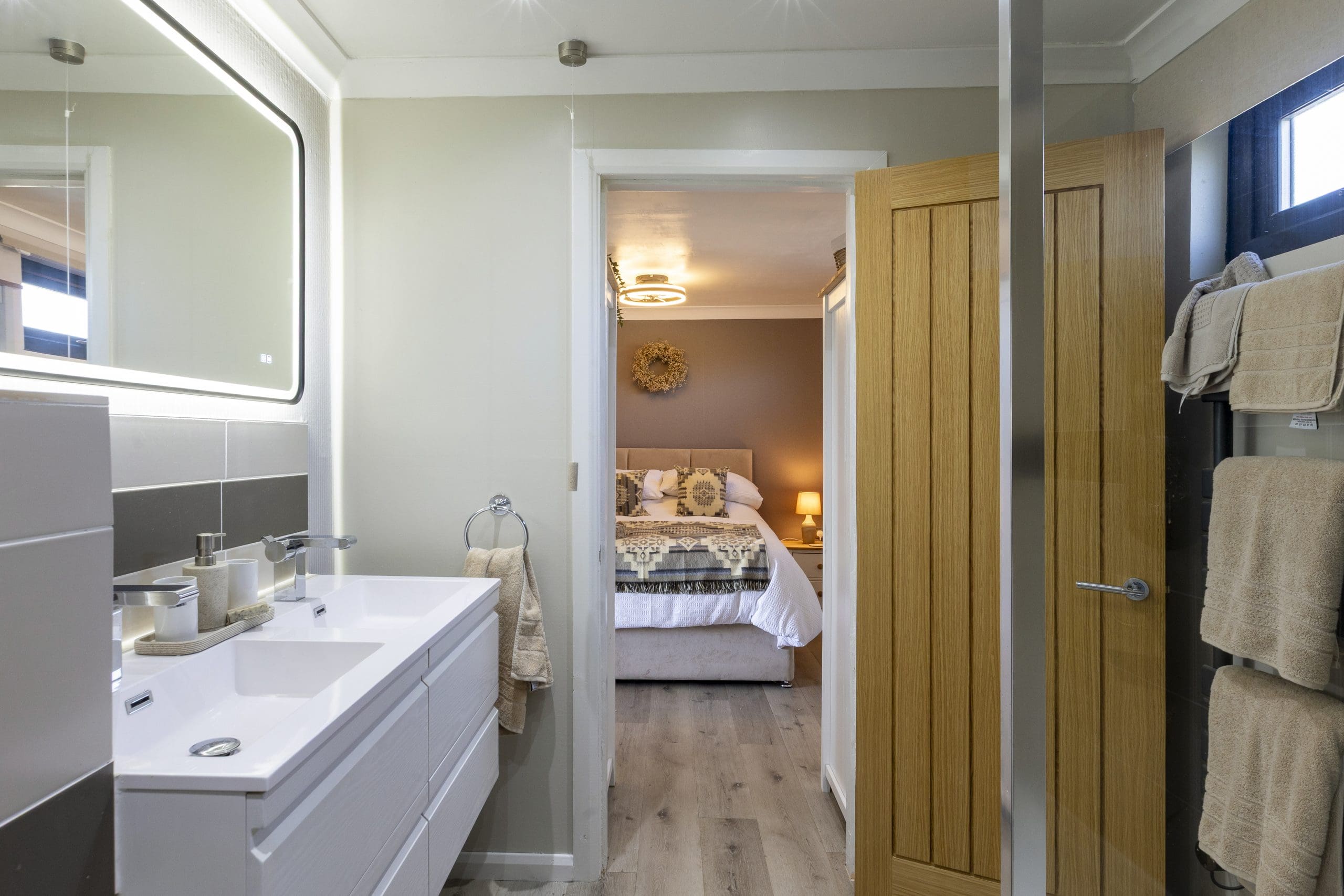 Designed as a signature suite for honeymoons in Yorkshire, Taras Sarn Lodge is a complete sanctuary of rest and romance. The bedroom is a calm and cocooning space dressed in soft neutrals and gentle hues to echo the landscape beyond. The sumptuous mattress and high-quality linens ensure a deeply restful night’s sleep. And, with ample storage and luxury touches throughout, everything has been carefully considered so you can fully switch off and unwind together in absolute peace.