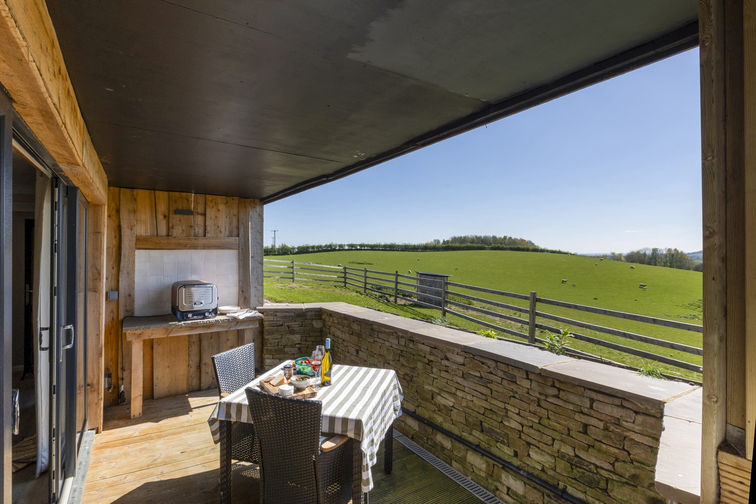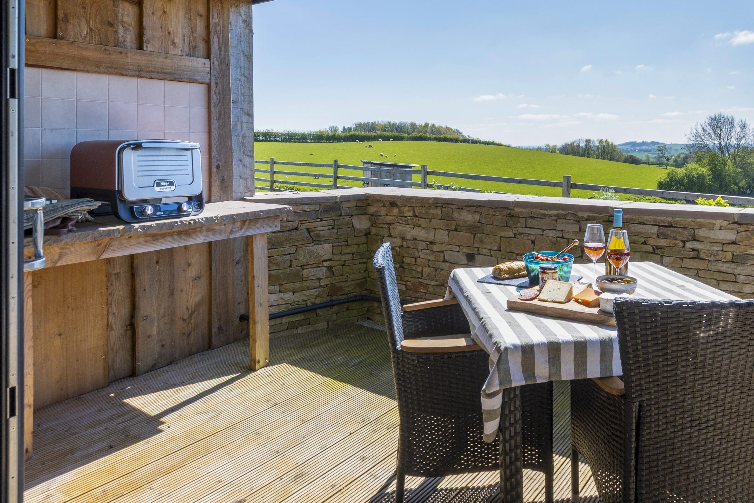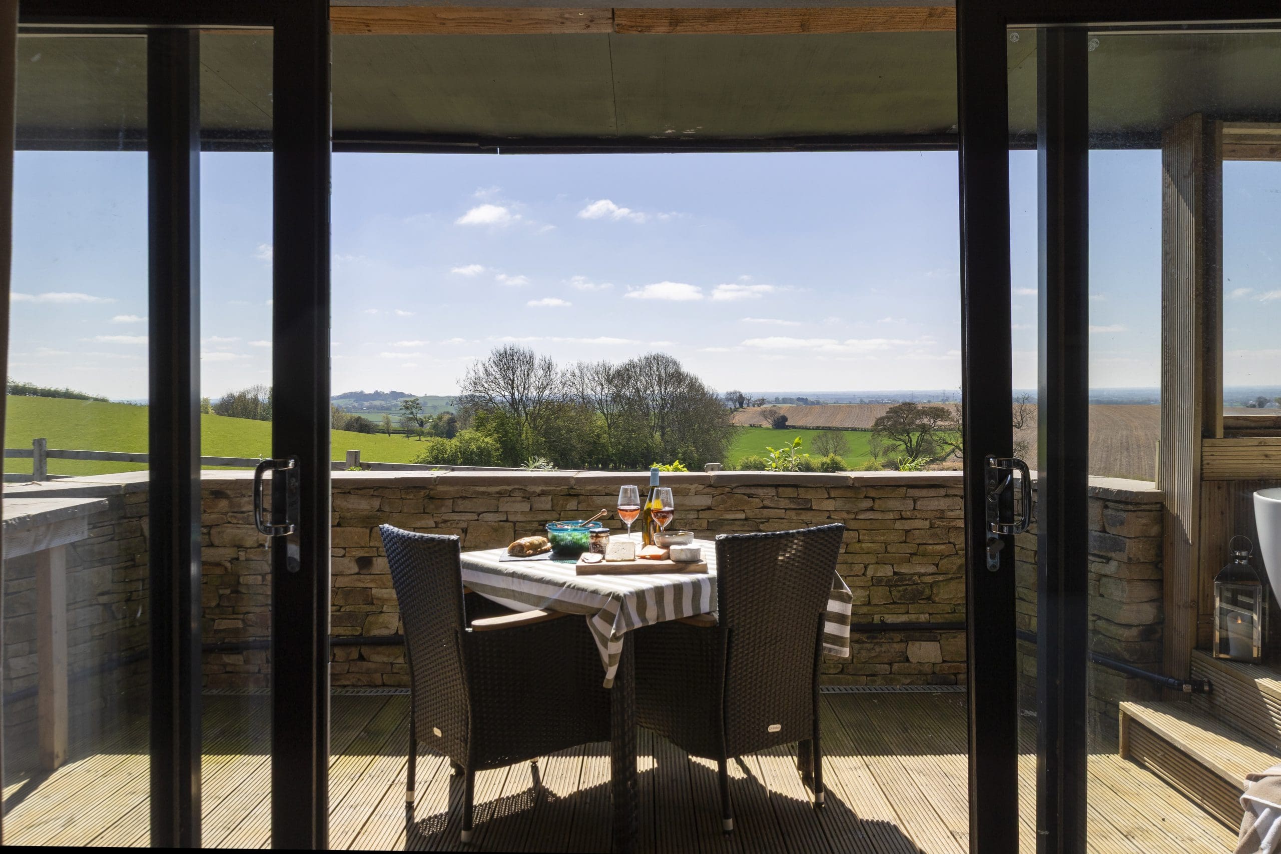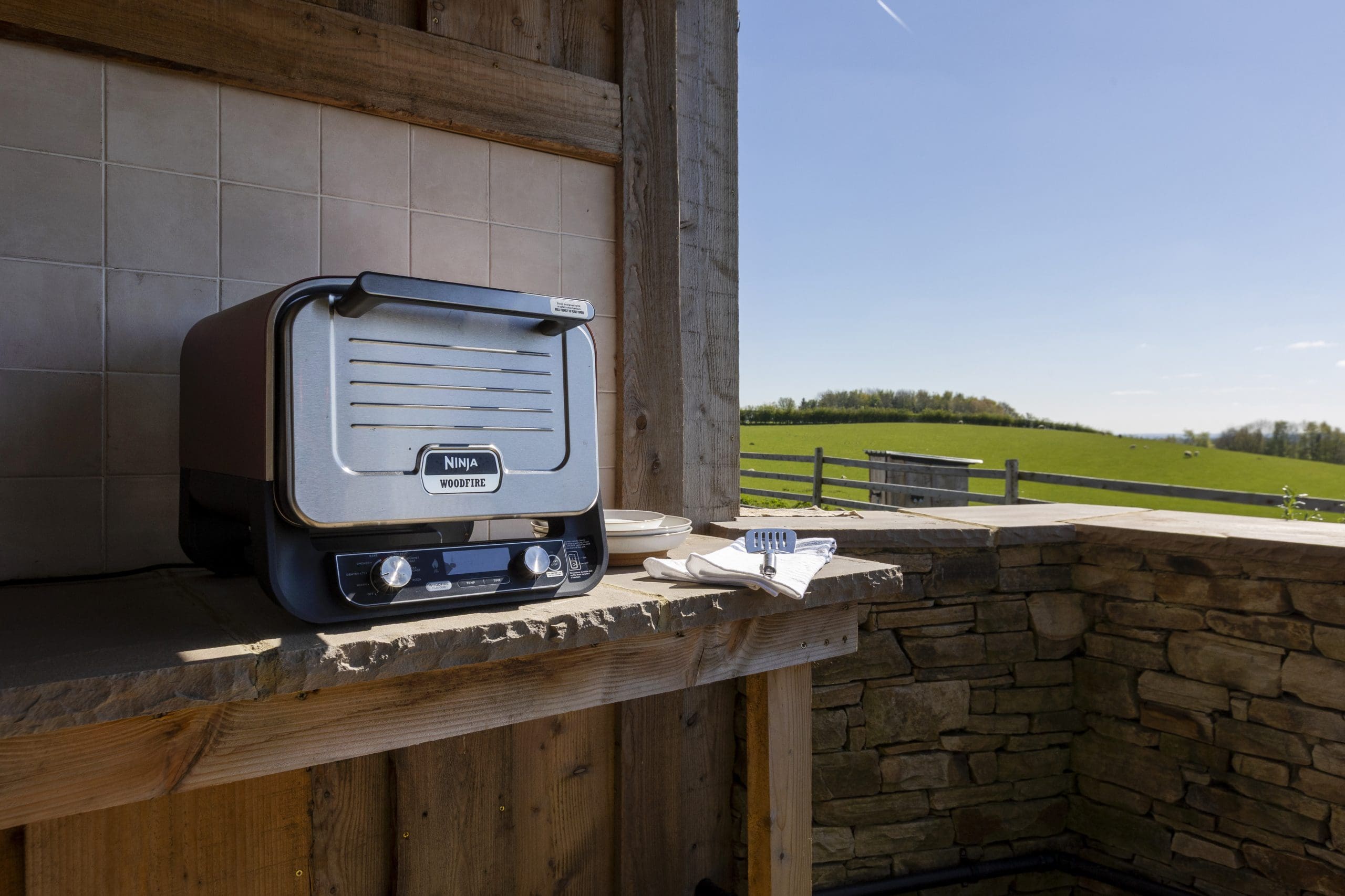 Slow mornings and long, lingering evenings come naturally here at Taras Sarn Lodge. The beautiful kitchen is fully equipped with everything you need to prepare a simple breakfast and an indulgent suppers for the two of you. With special touches throughout, like a barista coffee machine, NutriBullet, and an array of quality cookware, making meals together will be a dream. You’ll also find some tasty local treats waiting for you on arrival including tea, coffee, fresh bread, butter, jam, eggs, and a bottle of Yorkshire wine, so there’s no need to leave your lodge for a while. The intimate table for two is positioned perfectly for you to drink in the sweeping views beyond the glass doors as you eat, or just step outside to the covered veranda if you fancy dining al fresco – whatever the weather. The outdoor Ninja Pizza oven invites relaxed dining as the sun sets over the Vale of York.