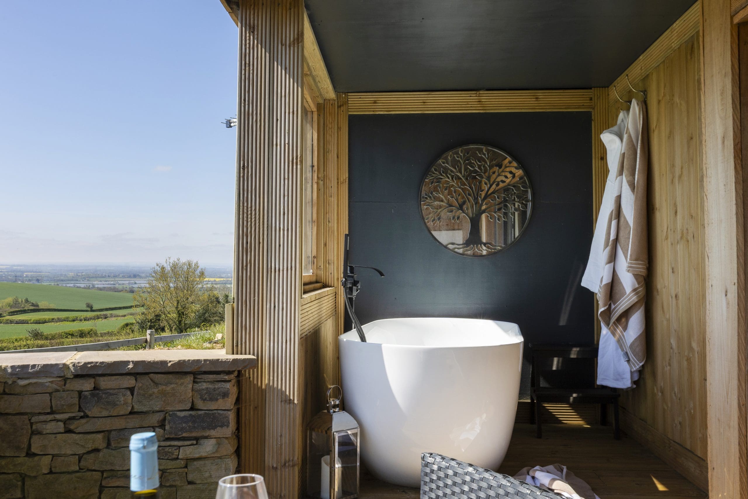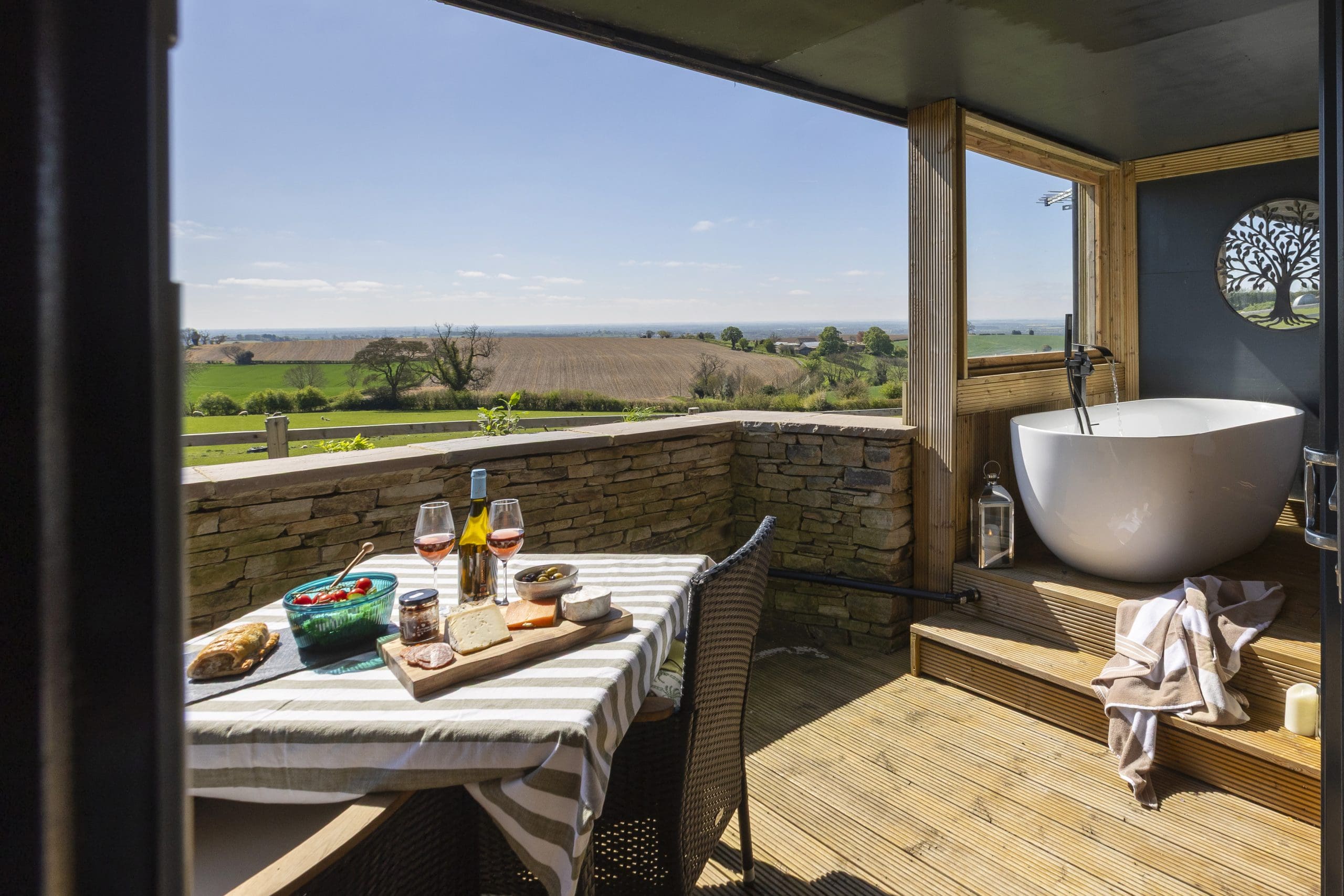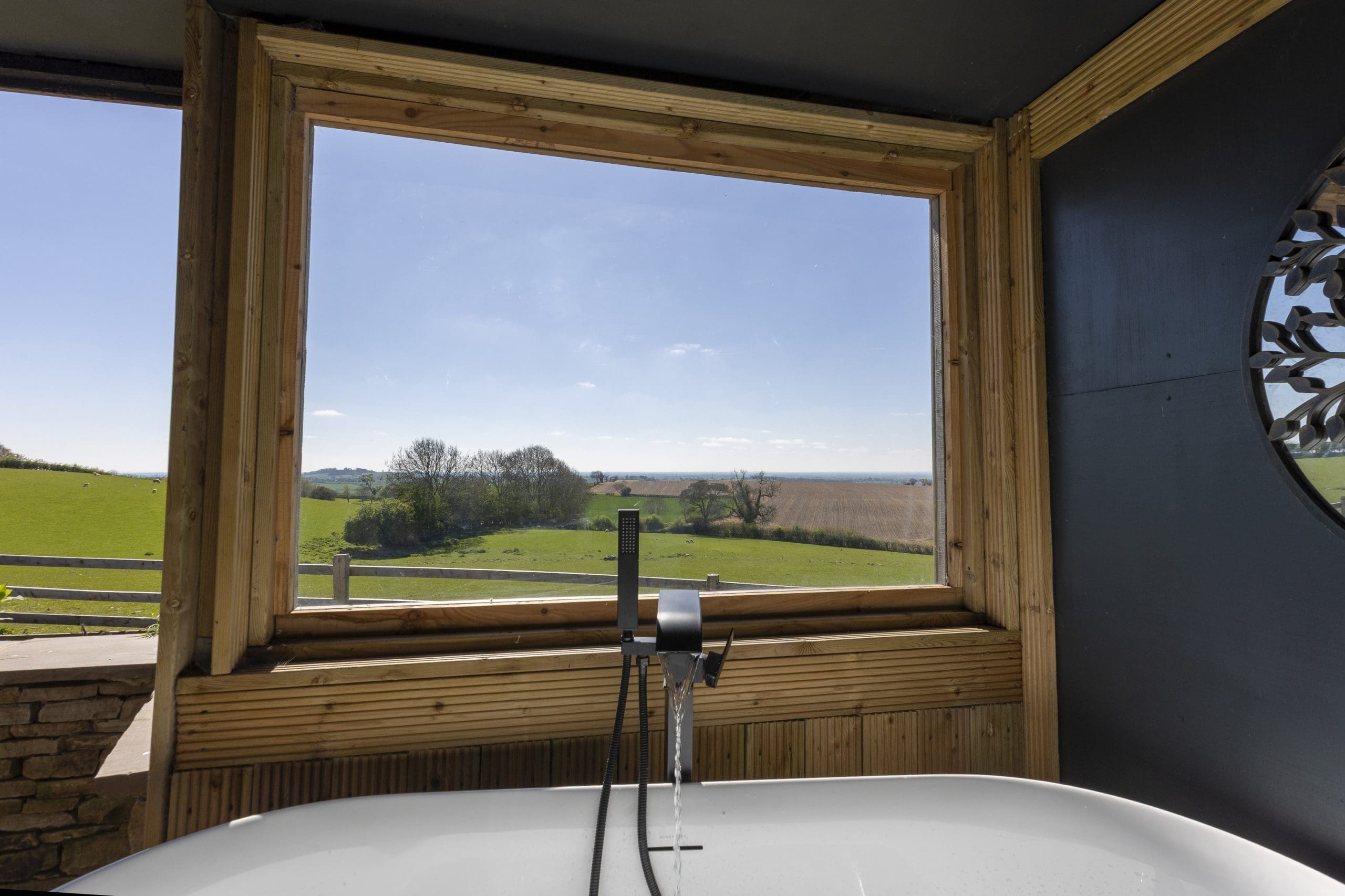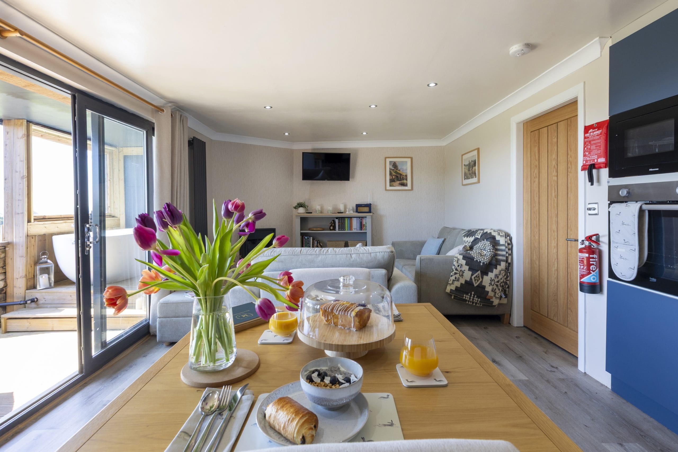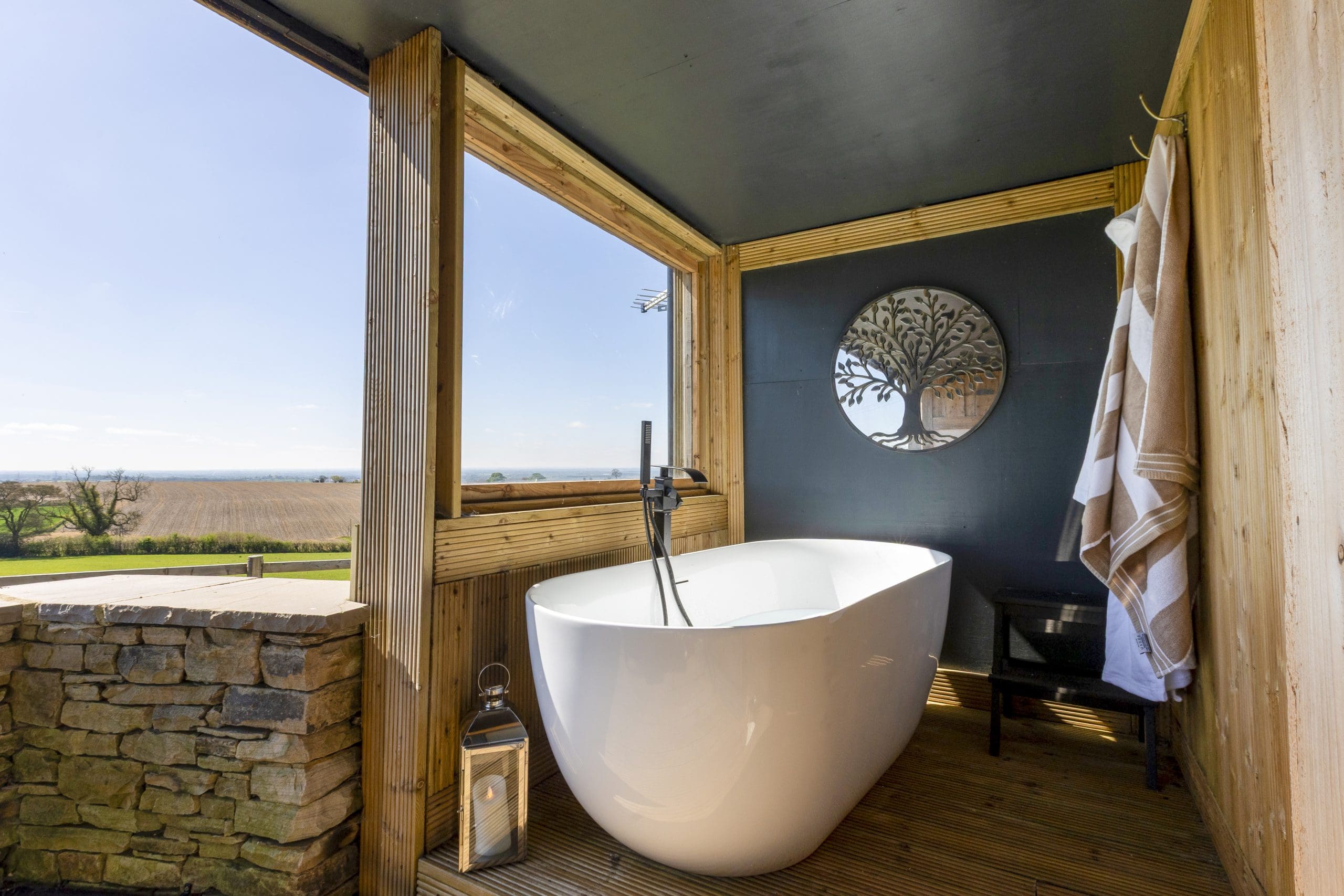 Life slows down the moment you arrive. The light-filled living area at the far end of the lodge offers a peaceful space to settle in, whether that’s curling up on the sofa by the electric fire, listening to your favourite tunes or gazing out through the floor-to-ceiling windows at the rolling meadows. Step outside and the experience becomes even more special. On your private veranda, a freestanding outdoor bath tub awaits for long, indulgent soaks beneath the stars while you share stories and make plans for the following day. Sinking into warm water and bubbles with a glass of Yorkshire wine in hand is a moment that feels quietly unforgettable. Your private garden is also dotted with wildflowers and lined with blossoming trees, so you can enjoy the soft aromas as you bathe.