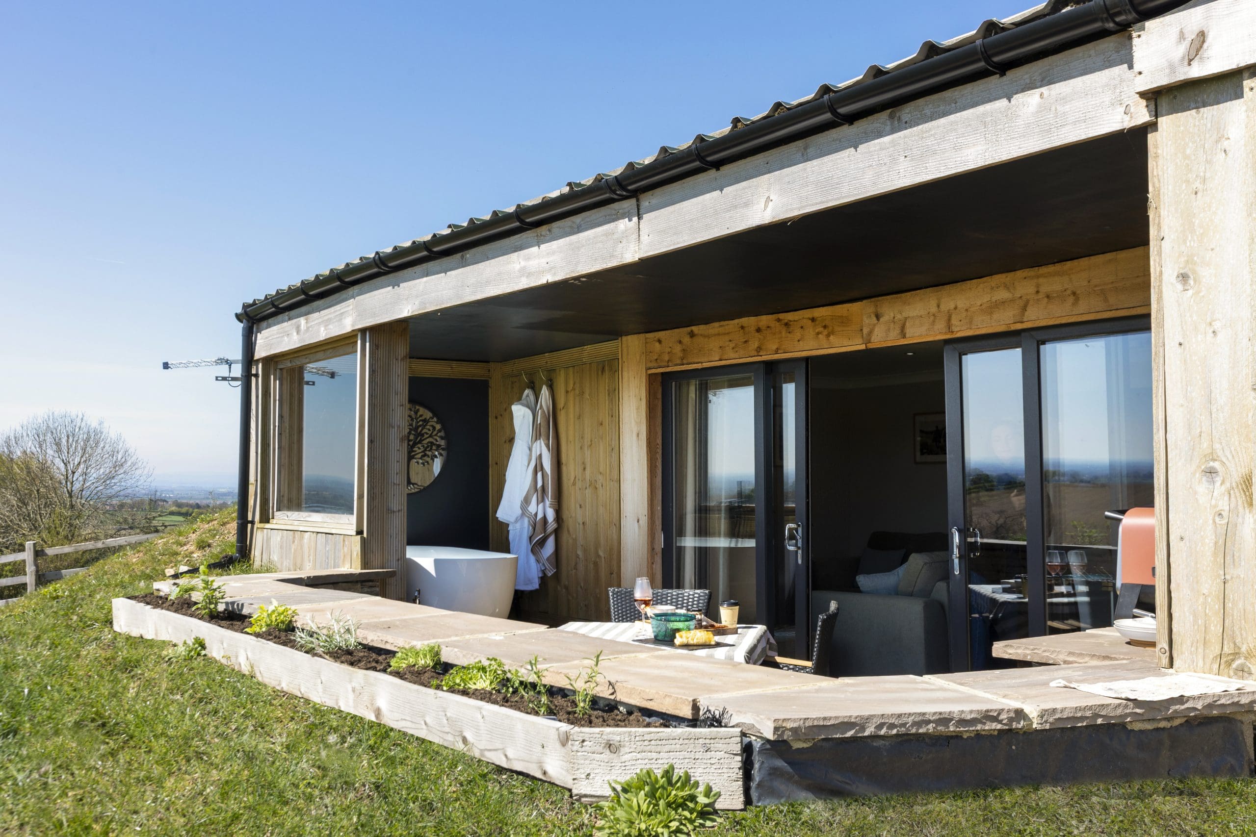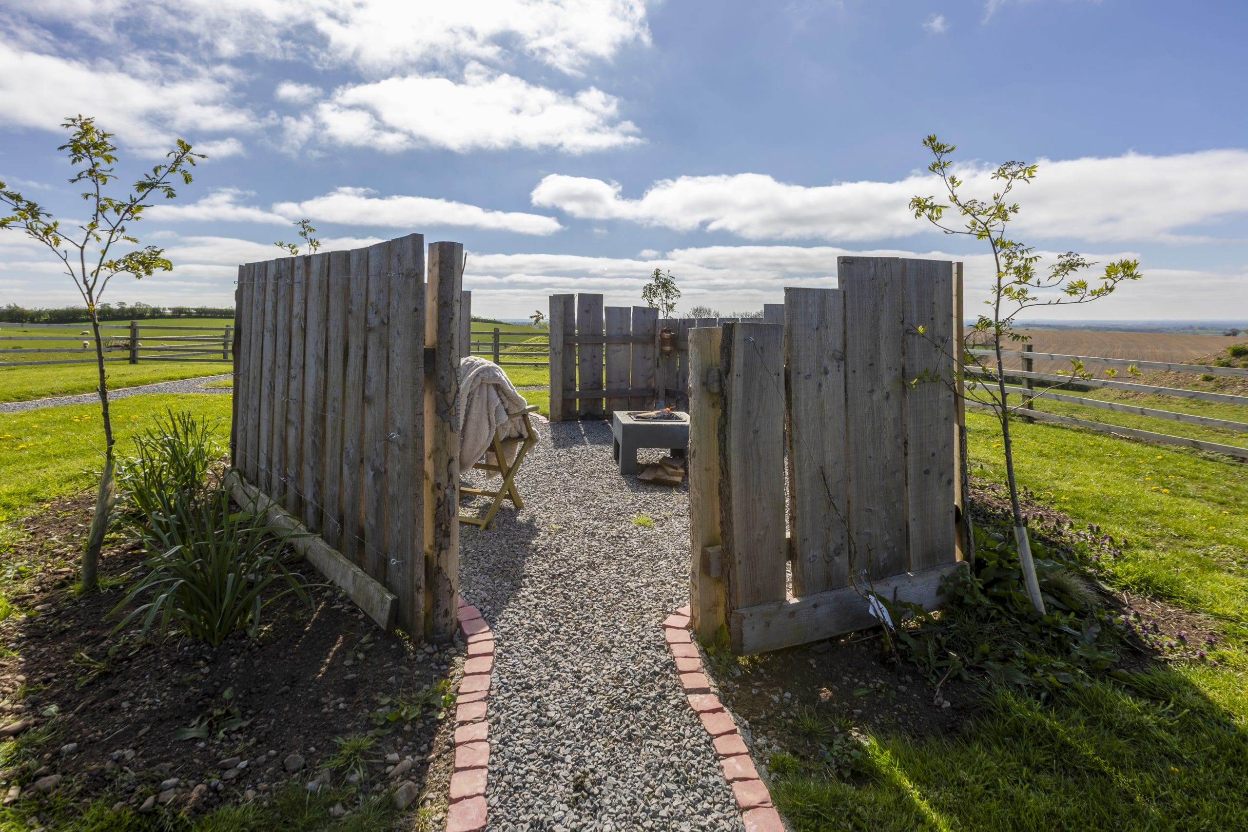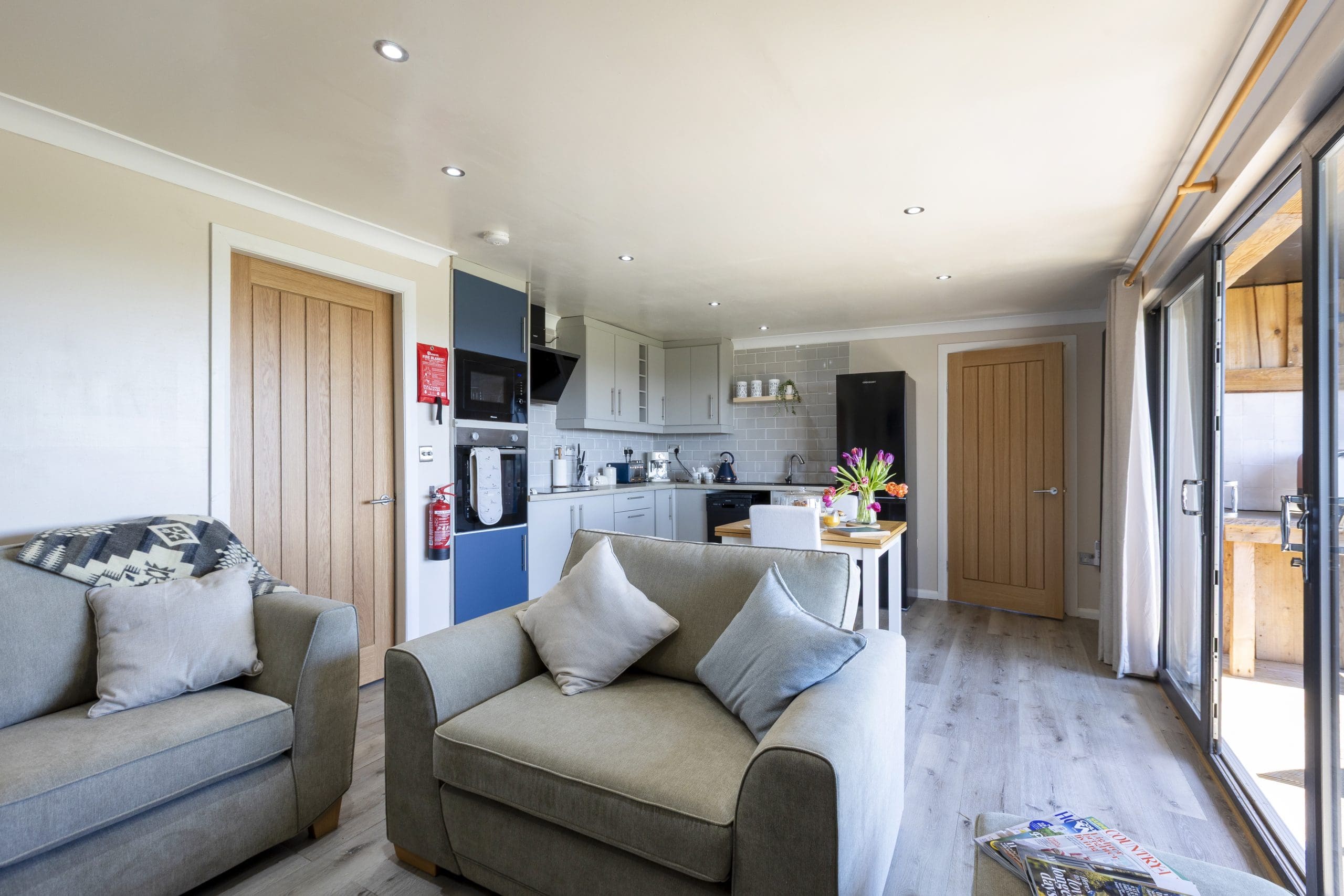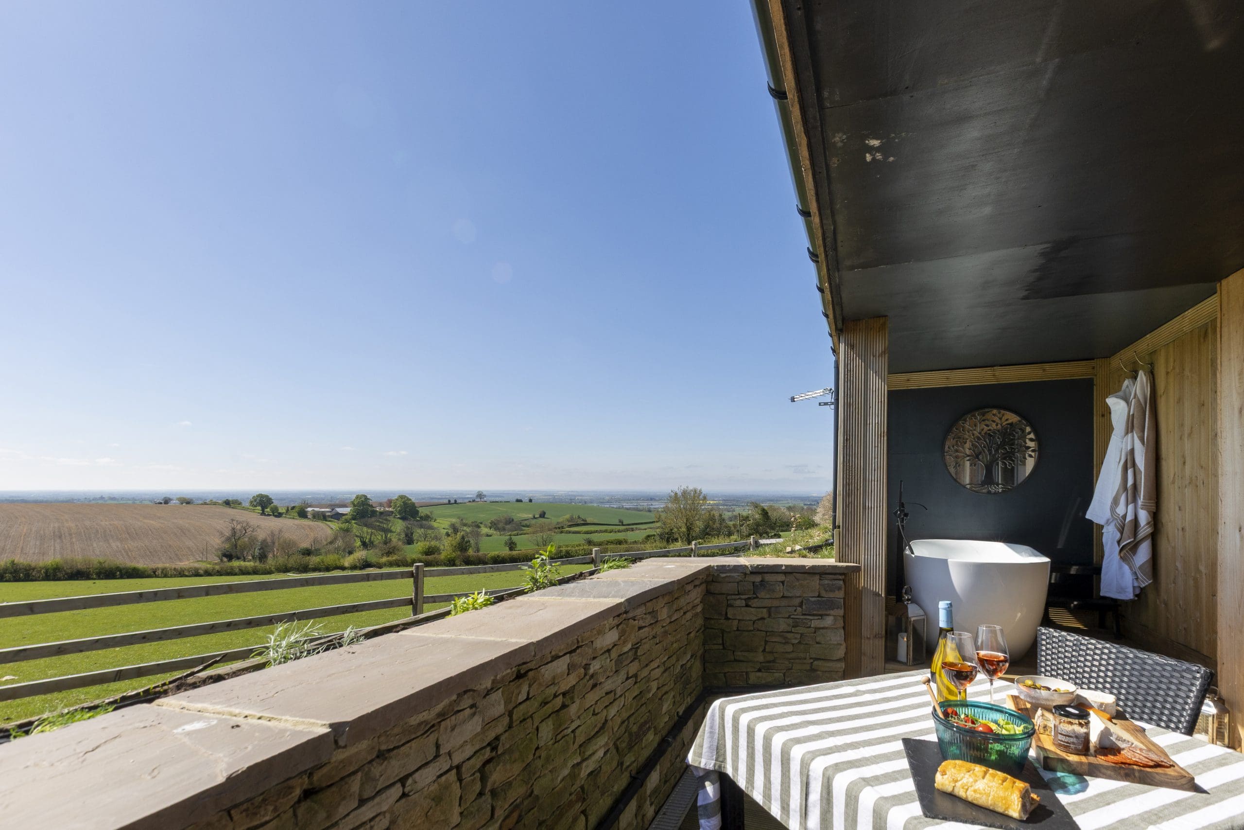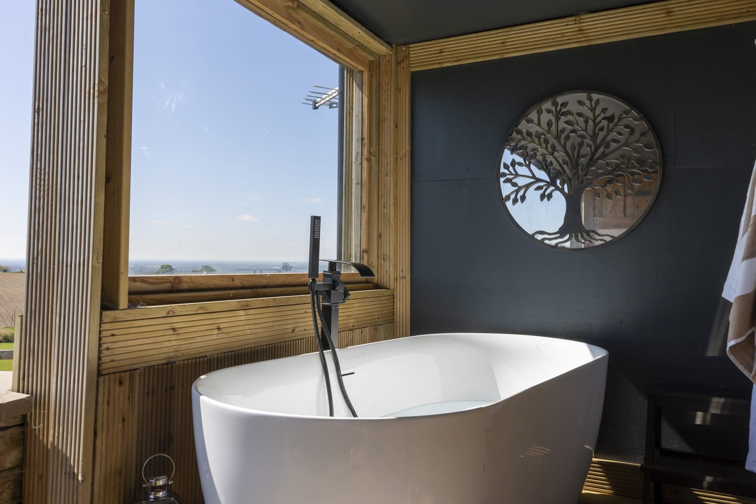 Life slows down the moment you arrive. The light-filled living area at the far end of the lodge offers a peaceful space to settle in, whether that’s curling up on the sofa by the electric fire, listening to your favourite tunes or gazing out through the floor-to-ceiling windows at the rolling meadows. Step outside and the experience becomes even more special. On your private veranda, a freestanding outdoor bath tub awaits for long, indulgent soaks beneath the stars while you share stories and make plans for the following day. Sinking into warm water and bubbles with a glass of Yorkshire wine in hand is a moment that feels quietly unforgettable. Your private garden is also dotted with wildflowers and lined with blossoming trees, so you can enjoy the soft aromas as you bathe.