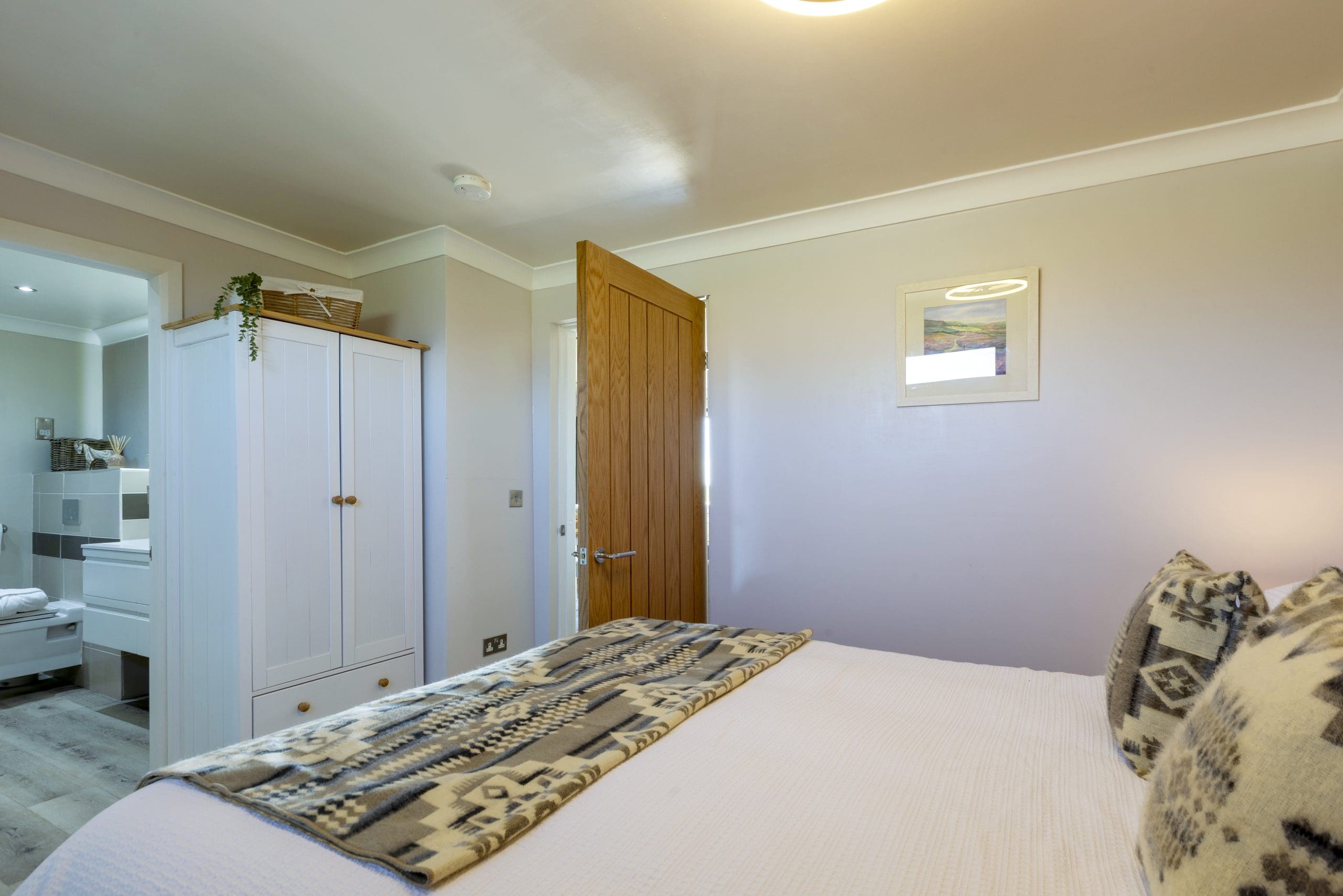 Bedroom with king sized bed, double wardrobes and ensuite shower bathroom.